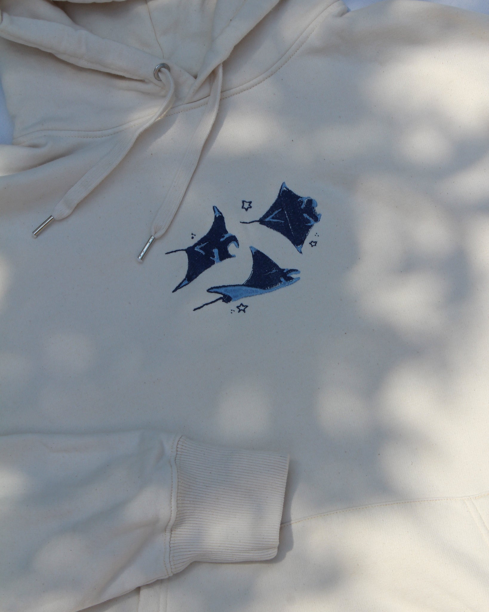 This manta ray hoodie is machine-embroidered in small batches from my studio. I use organic cotton and plant-based embroidery threads. This hoodie is designed intentionally, inspired by the ocean, and made to last!