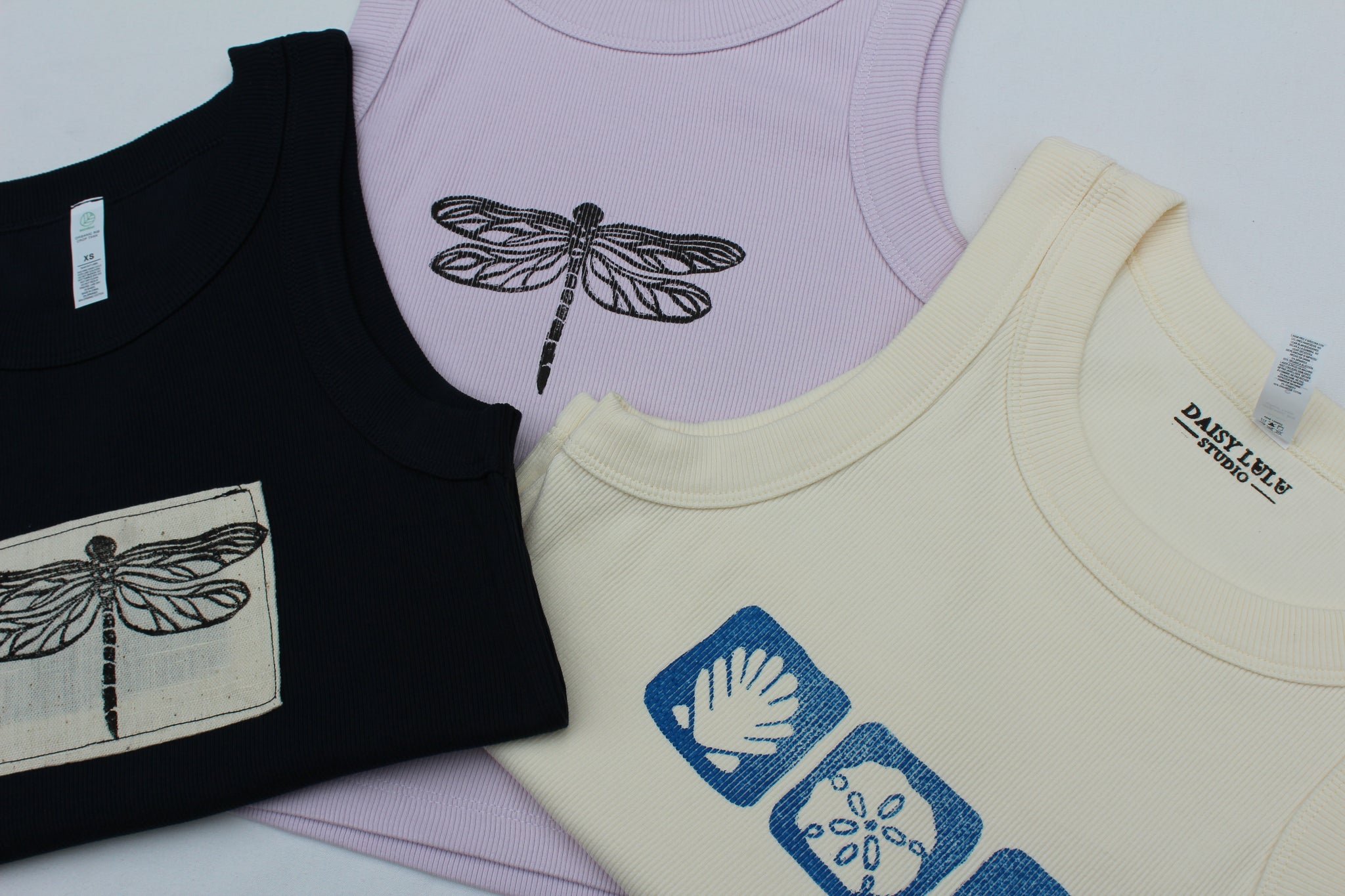 This tank was printed by hand using a carved block and water-based ink. Each shirt is pressed one at a time in small batches from my studio!